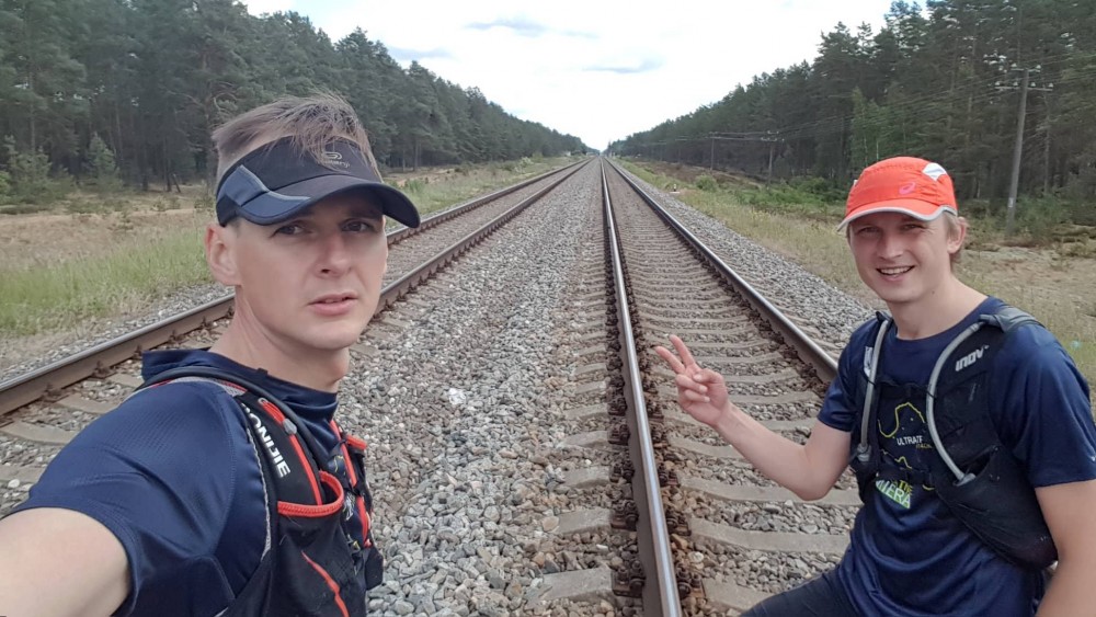 Aiz Maksteniekiem taciņas kļūst smilšainas, un pie Zaķumuižas sūkņu stacijas tiekam ārā uz P3 autoceļa. Šeit šķiramies – čaļi tālāk dosies iekšā Maltuves purva takās, bet es pa Siguldas šoseju uz Sēnītes Subway, kur abus skrējējus sagaidīšu. Priekā nesos pa asfaltēto segumu – mugurā pavējš un pedāļus var mīt vismaz divreiz ātrāk. Pēc 40 minūtēm esmu galā. Skatos live activity, kur čaļi, un rēķinu, ka apmēram stunda jābumbullē. Mēģinu nenokavēt pareizo brīdi, kad abiem pasūtīt siltus hotdogus. Tos gan man DUS pārdevēja izsniedz vāji remdenus. Skats, ko ieraugu, mani neiepriecina – tālumā tuvojas tikai Ģirta stāvs, Matīsu neredzu. Kamēr Ģirts atskrien, savā prātā jau esmu uzrakstījusi scenāriju, ka tagad piedzīvojums beigsies – Matīsam viss slikti un viņš kaut kur mežā gaida evakuācijas transportu, bet Ģirts vēl skrien, lai savāktu vismaz simboliskos 42 kilometrus… Tomēr Ģirts atskrien ar pārāk priecīgu sejas izteiksmi un rosās kā kontrolpunktā, nevis finišā. Skaidrs, mēs turpinām! Pēc brīža parādās arī Matīss – lai stabilizētu pulsu, viņš ik pa laiciņam pāriet soļos. Ģirts savu hotdogu jau ir nolocījis, Matīss taisa pirmo kodienu. Pēc trešā viņš pazūd DUS labierīcībās uz restartu. Sapildu čaļiem sistēmas, sadalu jaunas želejas un no Ģirta noskaidroju, ka Maltuves purvs bijis sauss un skrienams. Lai šķērsotu Krievupīti, izmantojuši tajā samestos ķieģeļus. Tālāk esot bijis nepateicīgs posms gar dzelzceļu, kurā meklējuši piemērotāko segumu skriešanai. Vietām tās bijušas stigas malas, vietām dzelzceļa uzbērums, sliežu gulšņi vai pļavas no Piebalgas Stirnubuka. Vienīgais pozitīvais apstāklis šajā etapā esot bijis ļoti stiprais pavējš, kas dzesējis pusdienlaika svelmi.
