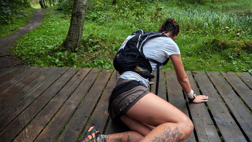 Pēc trešā dzirdināšanas punkta nopriecājos par gaidāmajām Amatas takām – vēl spilgti atmiņā gleznainie skati, redzēti nesen pavasarī, un jābūt salīdzinoši gludiem tuvākajiem kilometriem līdz Kārļiem. Tomēr no iecerētās vizuālās baudas nekā, jo man pa aizaugušo džungļu taku diezgan grūti skrienas. Laiku pa laikam aizķeros aiz kādas saknes vai grumbuļa un knapi savācos. Uz kādas slidenas laipas jau paguvu izplāties, nespējot izņemt līkumu vienlaikus ar pozēšanu fotogrāfam. Mana bleķa krūzīte aiziet pa gaisu. Ceļgals solās būt zils.