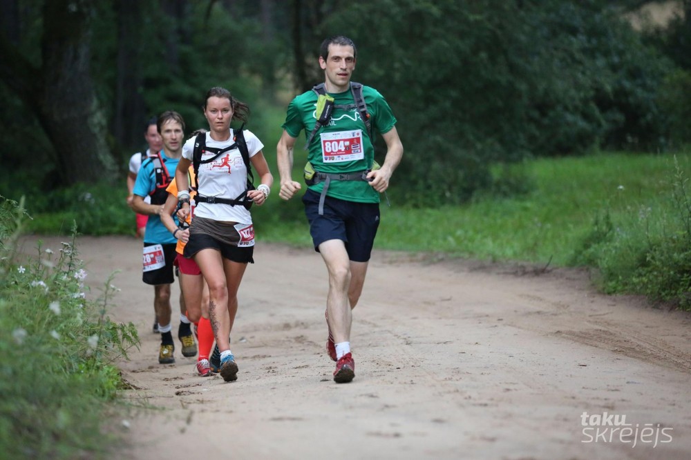 Temps ir ārkārtīgi krities, un ik pa brīdim tieku psiholoģiski iespaidota no sava ceļabiedra, ka lietuviete, no kuras ir izdevies atrauties, un arī Marta nesnauž, bet kaut kur jau tepat tuvojas. Nežēlīgi, jo jūtu, ka iekšā vairs nav. Kājas ir smagas. Morāle zema. Drūmas domas pa galvu. Šo es saucu par nomiršanu. Apzinos, ka šogad vēl nevienās sacensībās nav bijis tik smagi. Želejas loku iekšā negribot, ar pienākuma apziņu. Apsveru domu nākamajā punktā, ja līdz tam tikšu, stāties laukā. Palūdzu mani atstāt vienu, jo jūtos kā šunelis, kas pametis mājas, lai kaut kur klusumā un vienatnē nobeigtos. Ceļabiedrs it kā arī klausa, taču es neliekos mierā un kaut ko velkos pakaļ. Turpinām vien tālāk kopā. Garmin mēra par kādiem 3km mazāk, nekā jābūt, jo pie Amatas tilta punkta, kurš atrodas 44.km, man samērīti vien 40. Ar nepacietību gaidu, kad beigsies Amatas džungļi. Kāpums, kuram nevar redzēt galu. Padzirdot, ka aiz tā ir Kārļu punkts, izdodas uzrāpties diezgan viegli. Manu grūtumu palīdz aizmirst sarunas par dziļām un nopietnām tēmām.