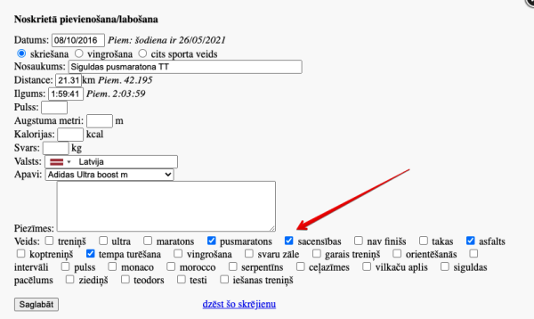 Kā to izmantot? Ir speciāla lapa, kurā ir iespēja veikt daudz un dažādas meklēšanas – pēc gada, apaviem, kilometrāžas un arī pēc šiem papildus veidiem. Atrast to var savā lapā zem “Mani skrējieni ar filtrēšanas iespējām“