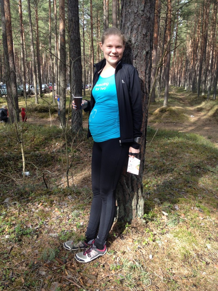 Vēl jāmin tāda svarīga lieta, kā apģērbs. Ikdienā valkāju skriešanas apģērbu izmēros XS-S, atkarībā no ražotāja un modeļa. Sākotnējais plāns bija mēģināt iztikt visu grūtniecību ar to apģērbu, kas ir, neko speciālu nepērkot. Ziemā mīļākais apģērbs ir Odlo jaka (XS), Odlo bikses (šķiet, slēpošanas, S izmērs) un Newline termokrekliņš (S/M). Ar tiem iztiku līdz pat aukstā laika beigām, jo vēders man auga lēnām, arī ķermeņa aprises īpaši nemainījās. Tomēr uz marta sākumu (otrā trimestra pašas beigas) bikses sāka atteikties turēties uz vēdera un krekliņi sāka rausties uz augšu. Tad arī nolēmu, ka negribu atlikušo laiku mocīties ar apģērbu un ķēros pie speciālā apģērba piedāvājuma izpētes. Es biju vīlusies. Apģerbs ir vai nu funkcionāls (iebūvēts atbalsts mugurai un/vai vēderam, iebūvēts krūšturis etc), vai nu simpātisks (kas manās prasībās – “nav melns/balts/rozā”), vai nu nepieejams izmēru/piegādes dēļ. Rezultātā pēc vairāku vakaru izpētes un domāšanas, nolēmu, ka funkcionāli varu papildināt apģērbu ar nepieciešamo arī savādāk, bet izbaudīt grūtniecību gribu ar prieku, tāpēc apstājos pie Two For Fitness krekliņiem un biksēm. Jāsaka, neko daudz izskriet ar tiem nepaspēju (par to kādu citu reizi), bet apģērbs ir ļoti ērts. Biksēm ir augstā josta, ko var pārvilkt pāri vēderam arī pēdējos mēnešos, krekliņi ir speciāli pagarināti un sānu malās savilkti, lai vēderam ir vieta, audumi kā jau sporta apģērbam – mīksti un mitrumu novadoši.