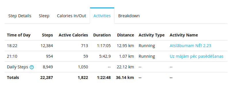 Pirmajā skrējienā Vivofit sasinhronizēju ar pulsa jostiņu. Jāsaka, ka šī bija pirmā un pēdējā reize. Tas droši vien ir domāts tiem, kas nodarbojas sporta zālē. Man Vivofit laiku ar jostiņu saglabāja 2 treniņos, no kuriem viens bija domājams tie 14km, ko es noskrēju, bet otrs, ko pastaigāju pa dzīvokli ar pulsa jostiņu. Kamēr GPS bija saskaitījis 14km, Vivofit tikai 13.36km, un ilgāku laiku, respektīvi, kamēr ir pulsa josta, tikmēr tas laiks tiek uzskatīts par kaut kādu aktivitāti, jo uz Vivofit nav iespējams nospiest start pogu tad, kad tiešām sākas aktivitāte, un stop, kad beidzas. Pēc datu sinhronizācijas tas izskatās šādi: