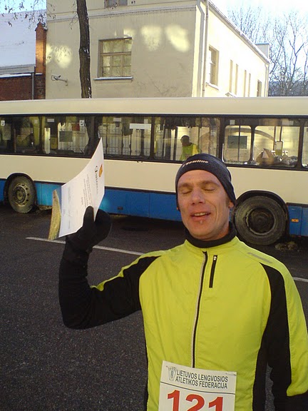 Mazliet novēlojoties ierodas tiesneši ar savu mikroautobusu, kur arī dabūnam numurus. Pārģērbties mašīnā ir mazliet sarežģīti. Sevi pilnībā spēju sakārtot vien tad, kad atbrauc pilsētas pilsētas autobuss ar skrējējiem. Ar iesildīšanos man iet visai čābīgi – mazliet pastaipos, jo nav siltāka apģērba, ko uzvilkt pa virsu, tāpat esmu piemirsis mājās sildošu smēri. Pārāk daudz arī neiesildos, mazliet pasprintoju un atgriežos iekš mašīnas, jo ceru, ka tikšu ar to galā pēc pirmajiem kilometriem. Man vien liekas, ka Kamparam šis variants ir vēl grūtāks, jo skrienot daudz ātrāk par mani, iesildīšanās ir nepieciešama vēl rūpīgāka. Beidzot, esam sagaidījuši to momentu, kad mūs izsauc uz starta līniju. Ceļa platums standarta – nav nekādi stāvlaukuma izmēri, tāpēc, skrējēju kolonna mazliet izstiepjas. Lietuviski saprotu maz, bet nojaušu, ka tiesneši un speciāli uzaicināta persona novēl mums veiksmīgi finišēt.