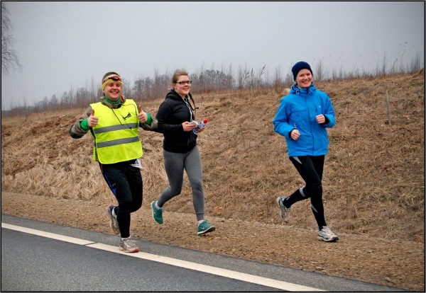 Tā nu esam tikuši ārā no Rīgas un sākas Vidzemes šoseja. Ieslēdzu savu blāvo pieres lampiņu. Pulss nostabilizējies, bet tik un tā šķiet krietni par augstu, Ģirtam krietni zemāks. Treniņos mums parasti ļoti līdzīgi. Viņš man saka, ka es esot par siltu saģērbies. Pēc kāda laika attaisu jauku. Bruņojies esmu ar pudeļu jostu 4×0,125 L isostar dzēriena un želeja. Plāns, ka līdz 2:40 jau būtu jāpamet Garkalnes KP pildās labi. Līdz KP ir jau neliels handikaps. Tas labi, jo beigas noteikti būs lēnākas. Ik pa laikam pieķeru sevi pie domas: ja es tikšu līdz galam, tad būs … konkrēti vairs neatceros, bet piezogas šīs šaubas. Mēģinu sevi motivēt, ar tekstu, ka es noteikti tikšu līdz galam un šaubas aizgaiņāt, bet tās visu laiku atgriežas. Kontrolpunktā novelku cepuri, atdodu Zanei. Uzpildu izdzertās pudelītes, padzeros brīvprātīgo piedāvāto ūdeni un dodamies ar Ģirtu tālāk. Uz šosejas jau krietni izretojušies. Redzamas tik atsevišķas gaismiņas priekšā un aiz muguras. Pulss joprojām spītīgi augsts. Temps šķiet piemērots. Cenšos skriet pa šosejas nomali. Tā cenšos saudzēt samocīto potīti. Redzam jau Vangažu gaismas. Zane zvana Ģirtam un prasa, kur ir KP. Izstāstām un sakām, ka pēc 20 minūtēm mums vajadzētu būt klāt. Tā arī ir. Kontrolpunkts klāt. Tagad skatos, ka tur handikaps bijis jau 15 minūtes. Nav slikti. Atkal papildinu jostas pudelītes. Padzeros arī brīvprātīgo piedāvāto buljonu. Gards. Pirmo reizi sasveicināmies dzīvē ar Jāni jeb virtuālo paziņu DJ. Viņš apvaicājas, kā skrienas. Atbildu, ka ir OK! Viņš saka, ka viņam gan smagi. Pagājušogad līdz Raganai esot mierīgi aizskrējis, bet nu jau esot grūti pirms Sēnītes. Neko daudz nekavējamies. Skaļi paziņoju, ka Nr 83 dodas tālāk. Tad attapos, ka neesmu želeju apēdis. To jau var arī skrienot. Turpinām. Tāpat tērzējot ar Ģirtu. Panākam arī DJ ar kompāniju. Ģirts jau gatavs apdzīt, es saku, ka ne. Skriešu viņu tempā. Tā lēnā garā lejā uz Gaujas tiltu, pāri upei, pret kalnu Murjāņos. Sāk palikt gaišāks, bet joprojām jāskrien ar lukturi. Kāds ātrāks mūs apdzen. Mēs arī laikam kādu apdzenam. Iesmeju, ka Murjāņos fotoradars, nedrīkst pārsniegt ātrumu. Izskrienot no Murjāņiem maratons. Ģirts priecīgs, taisa selfijus. Pirmo reizi tik garu distanci noskrējis. Ar to arī viņu apsveicu. Man selfijs dikti miglains. Īsi pēc tam mūs apsteidz arī Gunta. Apsveicu viņu vārdadienā. DJ arī pāriet soļos pret kalnu. Mēs gan ne! Turpinām skriet. Klāt jau Raganas KP. Ģirts ar Zani mani pametīs. Māsa ar Kristu un Kasparu nekādas ziņas nav devuši! Raganā bija plānots būt 5:40. Handikaps tās pašas 15 minūtes. Apēdu kādu siera gabaliņu un marmelādi. Palūdzu, lai man atšķaida kolu ar tēju, kas brīvprātīgajos izraisīja interesi. Izsūtu visiem SMS par to cik tālu esmu ticis, atvados no Ģirta un Zanes. Pasaku paldies par atbalstu paņemu savu skrienamo somu, uzlieku mūziku. Kā pirmā sarakstā uzlikta Kalniem pāri! Tas jau dod atkal zināmu impulsu. Māsa ziņo, ka viņi Juglā. Saku, ka man viss OK. Lai tik brauc un tad jau tiekamies. Aptuveni pāris km aiz Raganas pārsteidz mani divi iespaidīga izmēra suncīši, kas draudzīgi neizskatās. Apstājos un sabļauju uz viņiem, lielākais nokaunas un apstājās, mazais gan ne. Atņirdzis zobus nesas virsū. Sabijos ne pa jokam. Nezinu, kas lika viņam apstāties, bet kad mūs šķīra vien kādi metri 3, viņš apstājās. FUUUUU! Lēni dodos tālāk. Kad suņa uzmanība pievērsta nākamajam skrējējam, es atsāku skriet. Zvana Ģirts. Stāsta par stāvolki trasē. Pirmais esot triatlonists, otrais Kristaps Broks, es drīkstot minēt, kas trešais. Jautāju vai tiešām Rolis. Atbilde ir apstiprinoša. Prieks par viņu! Izstāstu par suņiem, bet Ģirts saka, ka neesot neviens organizatoru telefons uz kuru piezvanīt, lai pabrīdina skrējējus. Nu neko darīt! Jācer, ka viss būs veiksmīgi. Turpinu mūzikas pavadībā skriet. Dzinja ar ko gandrīz reizē izskrējām no Raganas KP, jau krietni atrāvusies. Atkal zvana māsa. Kur es esot. Saku, ka kādi 4 km aiz Raganas. Pēc dažām minūtēm arī viņi klāt. Pasaku, ka man neko nevajag, ka varu turpināt skriet. Attopos, ka neesmu papildinājis dzērienu jostu. Atdodu tukšās pudelītes izstāstu, ko man vajag un turpinu skriet. Zane vēl prasa vai somu neatdošu. Saku, ka ne! Dikti jau netraucē. Tā kā viņas ar Kristu ir plānojušas kādus 10 km noskriet, tad nedaudz pabrauc uz priekšu un piestāj ceļmalā, sapilda pudeles un pievienojas man. Atslēdzos no mūzikas un atkal jautrā kompānijā turpinam. Solis krietni lēnāks, gaišs, pļāpājam. Ir noguruma pazīmes. Pirms pagrieziena uz Bīriņiem atļaujos pāriet soļos. Saku meitenēm, ka te taču pret kalnu. Kaspars pabraucis ar auto 5 km uz priekšu un gaida mašīnā snauzdams. Tā viņiem sarunāts ik pa 5 km. Kad meitenes pirmos 5 km noskrējušas attopos, ka neesmu želeju iepriekšējā KP notiesājis. Daru kas darāms. Atdodu arī mugursomu. Tomēr bez bija vieglāk. Nosecinu, ka pulsometrs arī grasās nomirt, atdodu to Kasparam mašīnā lādēt. Papildinu tukšās dzēriena pudeles. Kristai arī līdz tīrs H2O, kas tiek nests rokā. Kad esam gatavi turpināt, mēģinu telefonā noķert satelītus, lai nezaudētu GPS distanci, bet kaut kā neizdodas. Krista uzsauc, ka jāskrien, tuvojoties fotogrāfs. Atmetu ar roku edmundam un skrienam.