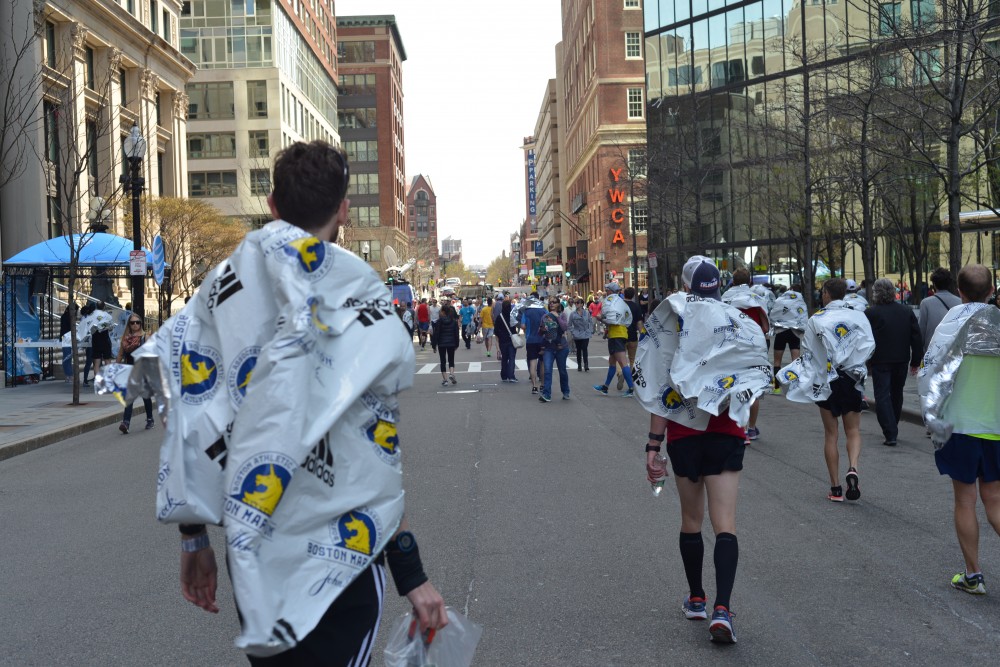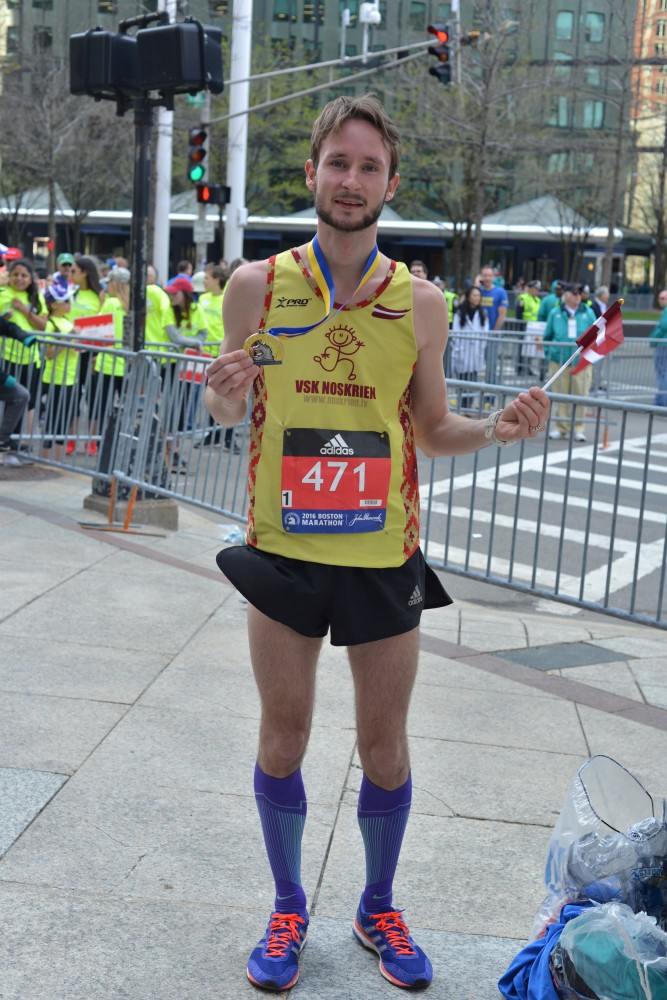 Vairs jau nav tālu, 35k un tagad viss tiešām iet lejā no kalna, gan pārnestā, gan burtiskā nozīmē, jo līdz pat 24. jūdzei trase ved praktiski nemitīgi lejup. Tagad gan vairs netaupu kājas un maucu lejā – ja pa vidu mani daudzi apdzina, kad rātni turējos pie sava plāna, tad tagad es daudzus apdzenu, nežēlojot kājas un ļaujoties nogāzes inercei mani nest. Parādās jau pilsētas aprises, nami kļūst augstāki un biežāki, vairāk betona, mazāk koku, tramvaja sliedes un atbalstītāju rindas ir vismaz seškārtīgas – pēdējie kilometri paskrien kā viesulis, garas taisnes, gar kurām sapulcējušies neskaitāmi līdzjutēji, vienotā unisonā atbalsta maratonistus. Nav iespējams izšķirt atsevišķus uzsaucienus, tas viss ir saplūdis – kaut kas tomēr manī ieslēdzās un paši pēdējie kilometri kā caur tuneli, kad vilciens tam traucas cauri – apkārt esošais kaut kā pagaist un izplūst. It kā redzēju atbalstītājus, dzirdēju tos, bet neko konkrētu neizšķīru, mammu arī centos ar acīm meklēt, taču cilvēku tik daudz. Pēdējos divos kilometros iesēdos astē vēl vienam, kas kāpināja tempu – viņš izskrēja zem 2:50, man vēl kāds gabaliņš pietrūka. Divpadsmit sekundes, kuras turpat startā arī nomīņājos. Paceļu rokas gaisā, sveicu Bostonas maratona izkārtni un apkārt esošos līdzjutējus un brīvprātīgos, un finišēju. Kājas diezgan pastīvas, bet citādi viss kārtībā, virzos tālāk, dodot ceļu citiem nule kā finišētājiem. Tādu bija gana daudz. Brīvprātīgie iedod folijas plēvi un sastiķē to kopā ar uzlīmi, lai nav pašam jātur. Medaļa, visādi batoniņi, ūdens un atjaunošanās dzērieni, maisiņš ar vēl kaut kādiem labumiem un aplausi, aplausi no brīvprātīgajiem, kas atzinīgi novērtē skrējēju paveikto. Sūtu viņu virzienā to pašu – situ plaukstas, saku paldies un novērtēju arī viņu ieguldīto darbu. Nav tālu vairs līdz mantu saņemšanai. Pie sevis pasmejos, ka visur valda vienlīdz haotiska somu meklēšana. Drīz vien gan tā ir pie manis un pieliecies cenšos sastūķēt visus labumus somā – to darot, ūdens pudele izkrīt no rokām un paripo zem nožogojuma, kāds brīvprātīgais piesteidzas klāt un iedod man vietā divus ūdeņus. Tas arī pasaka visu par viņu attieksmi pret šo pasākumu. Drīz vien atradu mammu ar viņas Latvijas karodziņu, mazliet patirinājos, mazliet pabildējos un pienāca kāds jauns puisis, tīrā latviešu valodā sakot “sveiki”. Tas gan bija viss, ko viņš mācēja – no viņa sapratu, ka ir tikai dzimis Latvijā, bet visu mūžu nodzīvojis ASV.