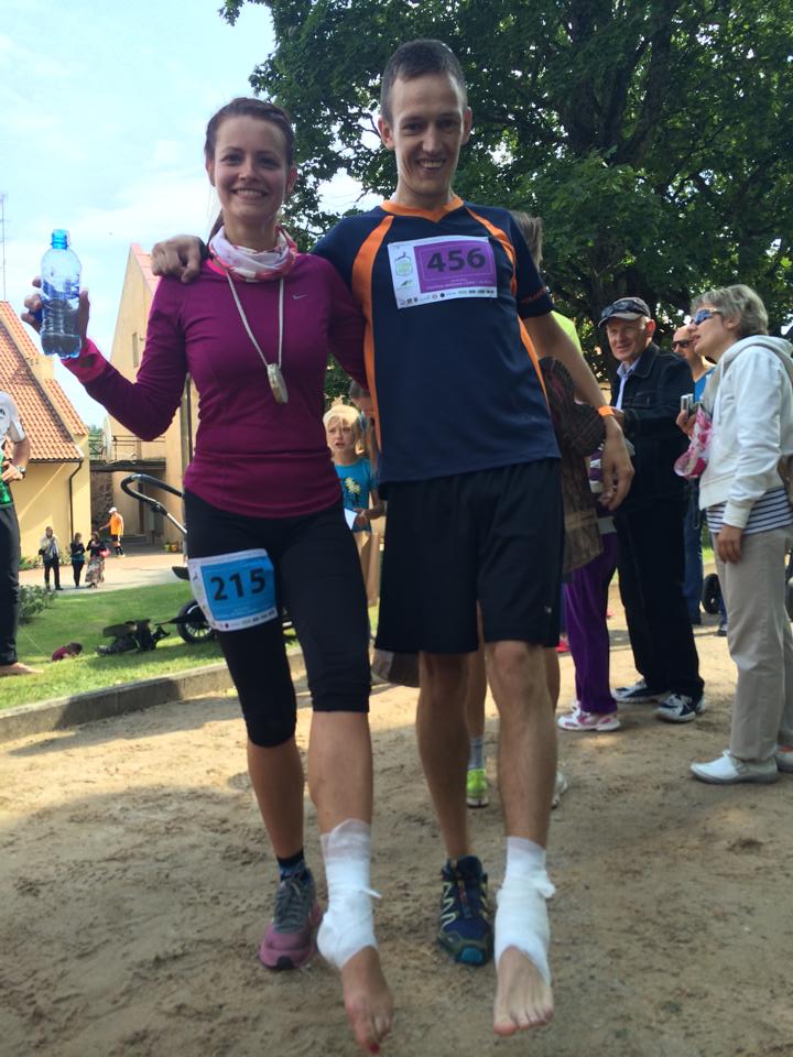 Par laimi nezinu, ka tie ir meli un patiesībā līdz finišam ir 9km. Divatā turpinām skriet, vispirms kolēģis izglābj mani un atgriež trasē, kilometru vēlāk X zīmi priekšā pamanu es un atgriežu mūs atpakaļ distancē. Katru reizi, kad parādās kāds īsāks vai garāks kāpums, jūtu, ka cīņa par otro vietu ir uzvarama, jo izskatās, ka pretiniekam iet smagāk. Nolemju, ka kādā no tuvākajiem kāpumiem man ir jāriskē un jāmēģina aizbēgt. Vienā no kāpumiem pat nedaudz izdodas dažus metrus tikt prom, bet kalna galā augšstilbu muskuļi deg elles liesmās un tieku ātri noķerts. Kā izrādās vēlāk, šī ir mana pēdējā pretestības izrādīšana.