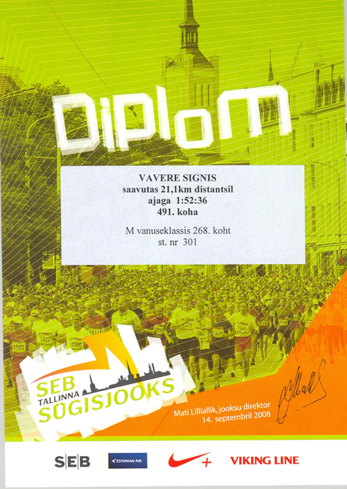 Liels bija mans pārsteigums un prieks, par vakardienas sūtījumu pasta kastītē. Jau sen aizmirsts pirmais pusmaratons pēc pusotra mēneša sevi atgādināja ar organizatoru gādību. Man tika atsūtīts diploms ar rezultātu, iegūto vietu un vēl dažādi reklāmas materiāli ar atlaidēm. Lai arī sīkums, bet ļoti patīkami un lielas iespējas nākamā gada Tallinas pusmaratona organizatoriem atkal mani redzēt savās sacensībās. Lasīt tālāk.
