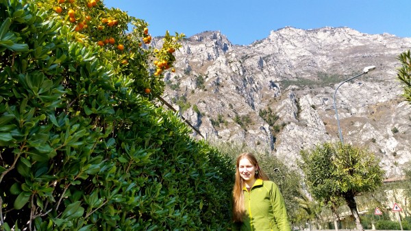 Dienas plāns – apbraukt apkārt Gardas ezeram. Jo tālāk uz siltajām zemēm, jo vairāk palmas. Ar palmām nekas nebeidzas, ielas malā aug apelsīni un šur tur redzami kaktusi. Es arī gribu bildi ar apelsīniem! Ja, kaut ko vēlies pasaki skaļi un tava vēlēšanās tiks izpildīta (kur meitenes vēlas aizbraukt, redzēt, uzkāpt?). Autoekipāža piestāj mazā ciematiņā, kur bija gandrīz viss – palmas, apelsīnkoki un citronkoki. Kaktusi pēc tam.