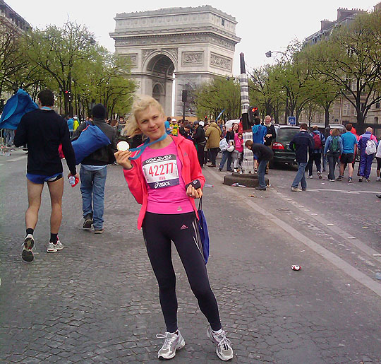 Parīzes maratons 2010. gada 11. aprīlī. Izlidojam no Rīgas jau piektdien, divas dienas pirms maratona. Braucām četras draudzenes – Zanda, Agita, Ieva un Linda. Visām mums tas bija pirmais maratons. Agita un Zanda pirms tam bija noskrējušas Nordea Rīga pusmaratonu, bet mēs ar Ievu – garākais 8km. Tātad, nekādas lielās skrējējas nebijām. Idejas ierosinātāja bija Agita, un tieši Parīze – tikai tādēļ, ka skaista pilsēta, skaista trase un laiks – pavasaris. Sākām trenēties diez gan pavēlu – janvārī, un, pateicoties garajai ziemai, tikai zālē un uz skrejceliņa. Ārā sākām skriet tikai no marta vidus, kad nokusa sniegs. Uz skrejceliņa skriet vairāk kā stundu ir gana garlaicīgi un vienmuļi, taču lieliski trenēja gribasspēku un apņemšanos. Divdesmitčetras stundas pirms maratona mēs gluži sieviškīgi nevis atpūtāmies, bet devāmies iepirkties par Parīzes veikaliņiem, ēst pusdienas un būtībā baudīt skaisto Parīzes pavasari. Sestdienas rītā gan izskrējām 6 km pa Elizejas laukiem, kas bija ļoti skaisti – ziedošas magnolijas parkos un daudz līdzīgu skrējēju ielās. Likās, ka visa Parīze skrien. Jāsaka, ka bija tāda piederības un kopības sajūta tādai maratonistu brālībai un Parīze sajutās pavisam citāda nevis kā citkārt, ierodoties kā tūristam. Agita un Zanda maratonu noskrēja 4:23 un 4:11, savukārt mēs ar Ievu virs 5 stundām. Katra izpildījām savus mērķus: Zanda un Agita ne tikai pieveica savu pirmo maratonu, bet izdarīja arī to lieliskā laikā, savukārt mēs ar Ievu godprātīgi izpildījām savu mērķi – noskriet un pabeigt maratonu.