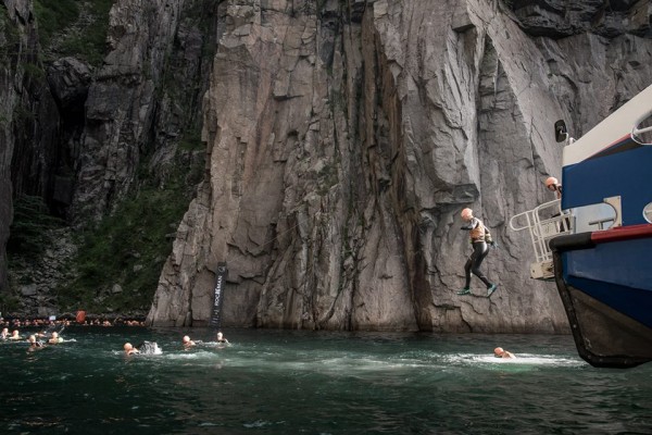 Līdz kontrollaika beigām ir 50 minūtes un 1.7km peldējums pāri fjordam – nav neiespējami, bet arī ne viegli. Vēl viena lieta, par ko esmu neskaitāmas reizes domājusi kopš pieteikšanās. Ātri sataisāmies, Baiba piestiprina organizatoru doto oranžo boju (drošībai un redzamībai), iekāpjam ūdenī. Sākas ilgākais peldējums. Fjordu sanāk šķērsot nedaudz ieslīpi uz augšu, t.i., pret straumi. Arī GPS ierakstā pēcāk var redzēt kā mēs vietām „zāģītī” esam peldējušas – straume, acīm redzot, pavilkusi atpakaļ – citādi es nespēju izskaidrot, kā 1.7km var peldēt stundu divdesmit, turklāt nevarētu teikt, ka jutāmies pārgurušas. Salīdzinājumam, Ķīšezeru pārpeldēju 1h un 7 min, bet kopā peldot – 1h un 26 min.