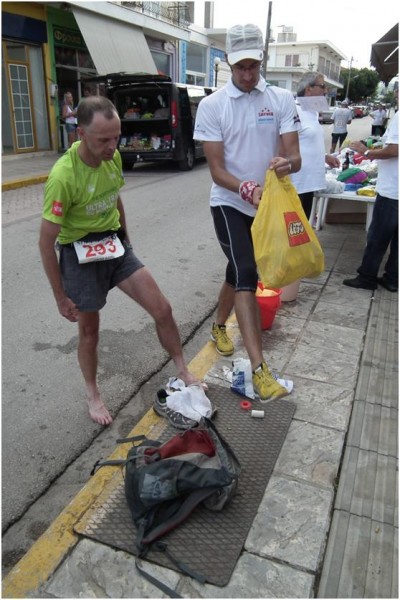 236.km benzīntankā ieskrien Džo, viņš minūtes desmit pavada, pļāpājot un pārspraužot numurus pie krekla. Tad atvadu buča un solījums sagadīt finišā ar Dionīsa cienīgu dzērienu. Džo priekšā pēdējie 10km, bet mēs traucamies atpakaļ raudzīt, cik tālu Laimonis ticis. Sastopam viņu vienā no punktiem, kur atbalstītāji nedrīkst sniegt savu palīdzību, tāpēc varam vien uzmundrināt un pateikt, ka gaidīsim viņu pie Leonīda, jo atlicis vairs pavisam nedaudz. Laika līdz prognozētajam Džo finišam nav atlicis daudz. Lidojam uz Spartu un noķeram viņu pāris km pirms krišanas Leonīda apskāvienos. Rodas problēmas ar mašīnas novietošanu, jo viss ir pārpildīts. Galu galā sprinta solītī dodamies virzienā, kur jābūt finiša zonai. Dzintars ieaurojas “Džo! Re, kur Džo!” un metas skriet cauri pūlim ar ātrumu, par kuru nebūtu jākaunās pat Boltam. Es žēli paraugos uz savām slīdošajām vasaras klikatām un mēģinu tenterēt nopakaļ, cik ātri vien tas ir iespējams.