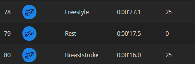 Kā redzams attēlā – es neesmu nekāda veiklā un izturīgā peldētāja, jo pēc katra baseina pieveikšanas nedaudz atpūšos. Garākās pauzes ir pļāpāšana ar treneri. Bet, ja par pulksteņa darbību, tad var redzēt, ka divos piegājienos baseina garums saskaitīts dubultā. Pulksteni gan šeit vainot nebūtu prātīgi, jo, tā kā peldēt vēl tikai mācos, tad brīžiem baseina vidū var gadīties kāds apjukuma moments, kurā vēziens tiek izjaukts un pulkstenis to var uztvert kā slīdējumu, kam būtu jānotiek tikai baseina galā pirms rokas atsitiena pret baseina malu.