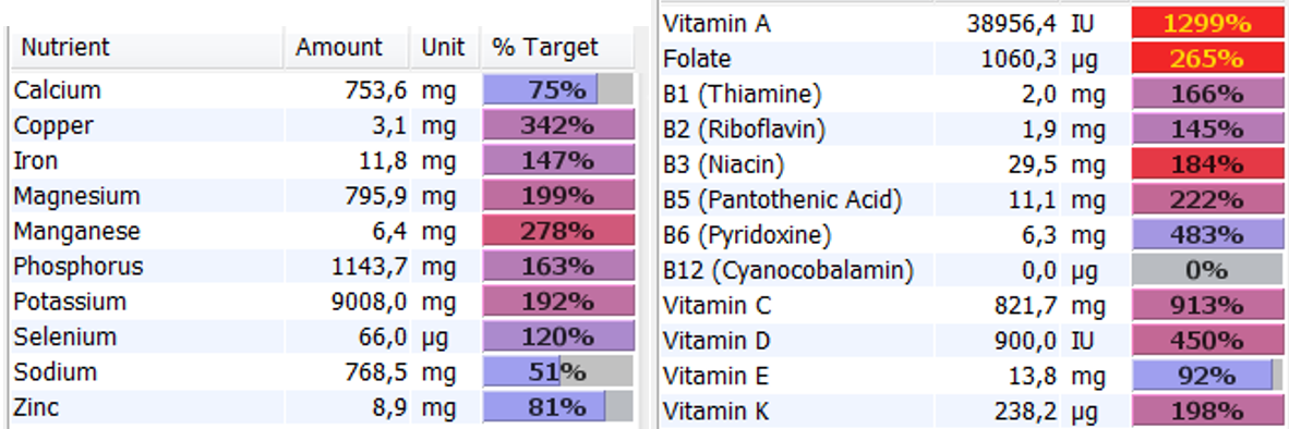 3400 kCal! Sākumā domāju, ka esmu kļūdījies ar ēdienu ievadīšanu, bet nē. Kaloriju attiecība 80/8/12. Apēsti 3.8 kg augļu. Rekords apēstajās kalorijās, un nu jau esmu vistuvāk optimālajam 80/10/10, kaut vienalga nesaprotu, kā kCal no taukiem var būt ne vairāk par olbaltumvielām. Dzelzs 275% no dienas devas. Kaut kā neizskatās, ka varētu būt lielas problēmas ar dzelzi, piedevām C vitamīns veicina dzelzs uzsūkšanos, un tas jau nu tiek uzņemts megadevās, un netiek ēsti graudu produkti, no kuriem daļa traucē uzsūkties dzelzij. Arī selēns un cinks ir tuvu 100%. Šodien kopumā izskatās patiešām labi vitamīnu un minerālvielu sadalījums, neskatoties uz absolūti vienveidīgu uzturu.