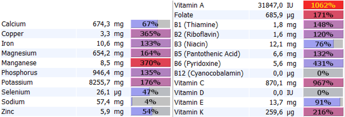 112 grami – burkāns, 110 g – zemesriekstu sviests, 1270 g – apelsīni, 1000 g – banāni, 200 g – bietes, 100g – lapu salāti, 25g – Indijas rieksti, 9g – zivju eļļa, 145g – avokado, 30g – granātābols.