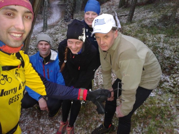 Kad dalībnieki jau iesiluši gan miesīgi, gan garīgi, paveras skats uz Zaļās kāpas galu. Tur tāds iespaidīgs kalns. “Gunta, lūdzu, lūdzu saki, ka mums tur būs jāskrien augšā!” Būs! Tiekam augšā un elpa aizraujas no augstuma un plašuma visapkārt. Drusku pasajūsmināmies un dodamies pa taku tālāk. Šķērsojam pāris kāpas pārrāvumus, kur pāri purvam uzbūvētas laipas. Sasalstošs purvs ar neaizsalušām ūdens bedrēm. Mazās purva priedītes uz normālo kāpu priežu fona. Brīžiem skrienam kāpai pa augšu, brīžiem gar malu, visapkārt kaut kas neaprakstāmi skaists, līdz nonākam pie grābeklīša. Nemaz nezināju, ka tur tāds ir – to noslēpis raidījums TE! Lai kā man riebtos selfiji, tomēr visiem gribas būt bildē, un garākās rokas īpašnieks tiek deleģēts uzņemt foto.