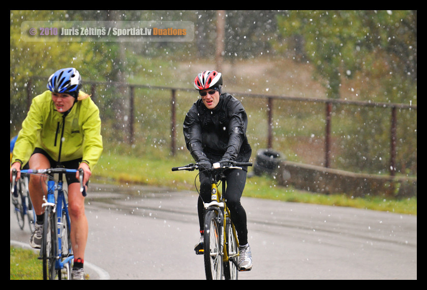 16.oktobra rīts ir sarmaini balts un saulains, ledus spainī 1cm biezs, taču, saulītei pakāpjoties augstāk, varētu gaidīt siltu dienu. Taču nē – iebraucot Rīgā, mūs sagaida melni mākoņi, kas atnes puteni. Jā, šodien manas sacensības duatlonā, šodien pirmais sniegs…Pat vārdu trūkst, iedomājoties šosejas riteni pa baltām kupenām braucot!